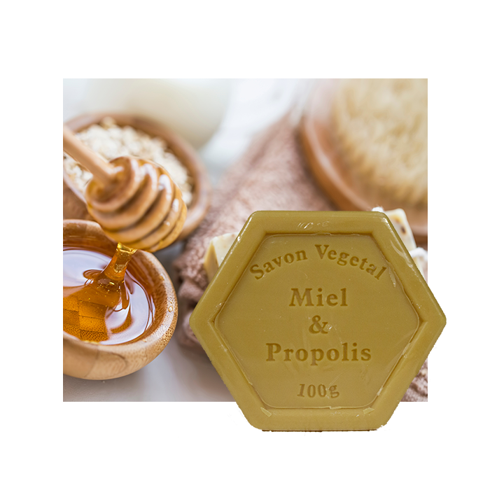 Sodium Palmate, Sodium Palm Kernelate, Aqua, Glycerin, Parfum, Mel, Prunus Amygdalus Dulcis Oil, Palm Acid, Sodium Chloride, Propolis, Palm Kernel Acid, Sodium Polynaphthalenesulfonate, Etidronic Acid, Tetrasodium EDTA, Tocopheryl Acetate, Limonene, Citral, Linalool, Citronellol, Geraniol, CI 77891, CI 11680, CI 12490, CI 74260